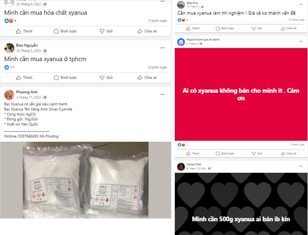 Ngoài ra, theo khảo sát trên các hội nhóm mua bán hóa chất, loại mặt hàng xyanua được chào bán và mua rất dễ dàng, không có ràng buộc hay quy chuẩn nào. Chỉ cần có nhu cầu, người bán sẵn sàng chào hàng.