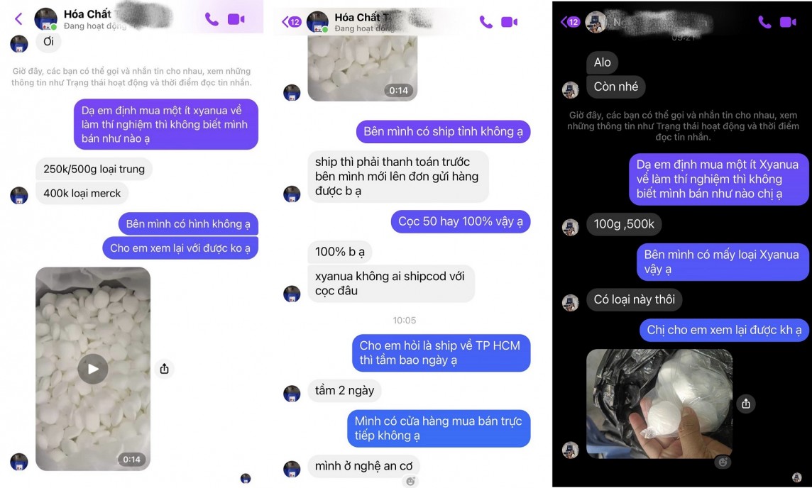 Theo tài khoản "Hóa Chất T.P", hiện nay cơ sở này đang bán với giá 250.000đ/500g hàng xuất xứ từ Trung Quốc; và 400.000/500g đối với hàng của hãng Merck (xuất xứ Đức). Sau đó người này yêu cầu khách hàng thanh toán 100% đơn hàng sau đó sẽ gửi xyanua đi, thời gian nhận chỉ khoảng 2 ngày.
