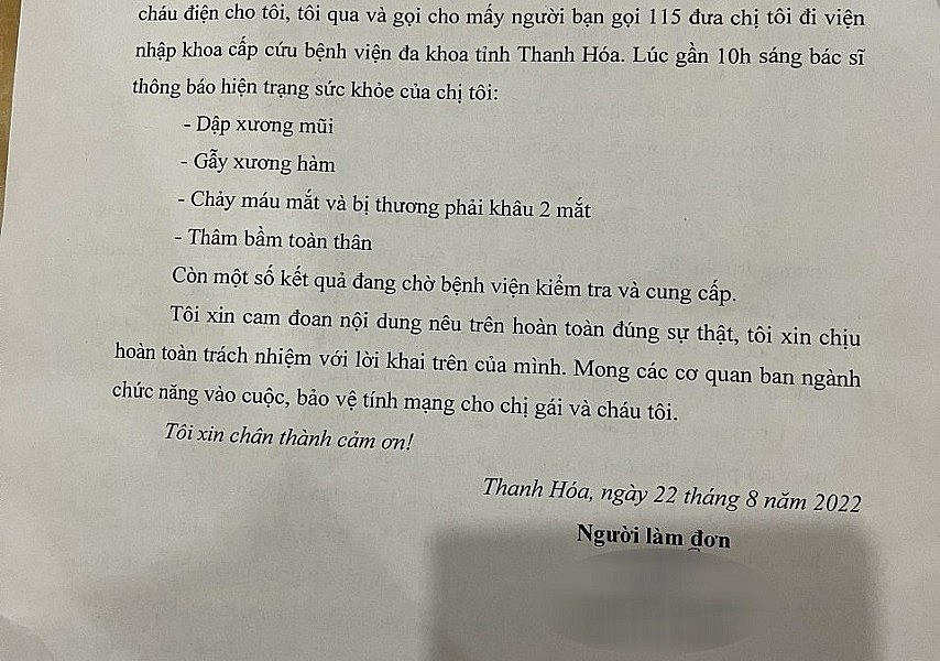 Theo đó, ngày 23/8, chị N.T.D (33 tuổi), trú tại phường Nam Ngạn, TP. Thanh Hóa, tỉnh Thanh Hóa đã gửi đơn tố cáo đến cơ quan chức năng tỉnh Thanh Hóa về việc, chị gái ruột của mình là N.T.V (37 tuổi), trú tại phường Lam Sơn, TP. Thanh Hóa bị một người bạn trai đánh đập dã man vào đêm 21 và rạng sáng ngày 22/8.