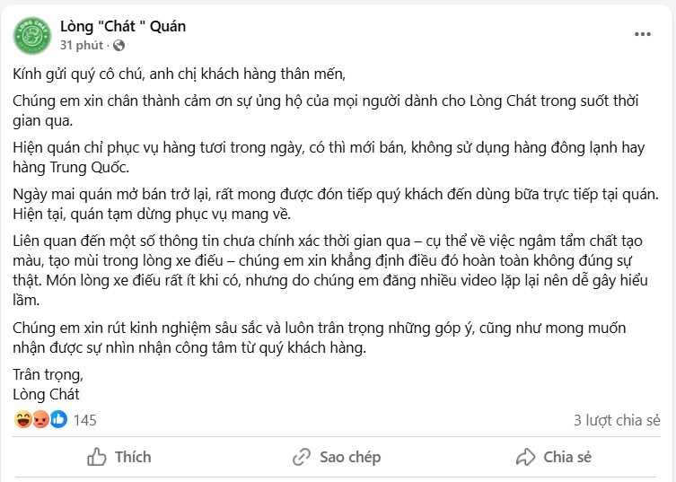 | Fanpage quán Lòng Chát thông báo mở cửa trở lại vào ngày mai, tuyên bố không sử dụng hàng đông lạnh hay hàng Trung Quốc. |