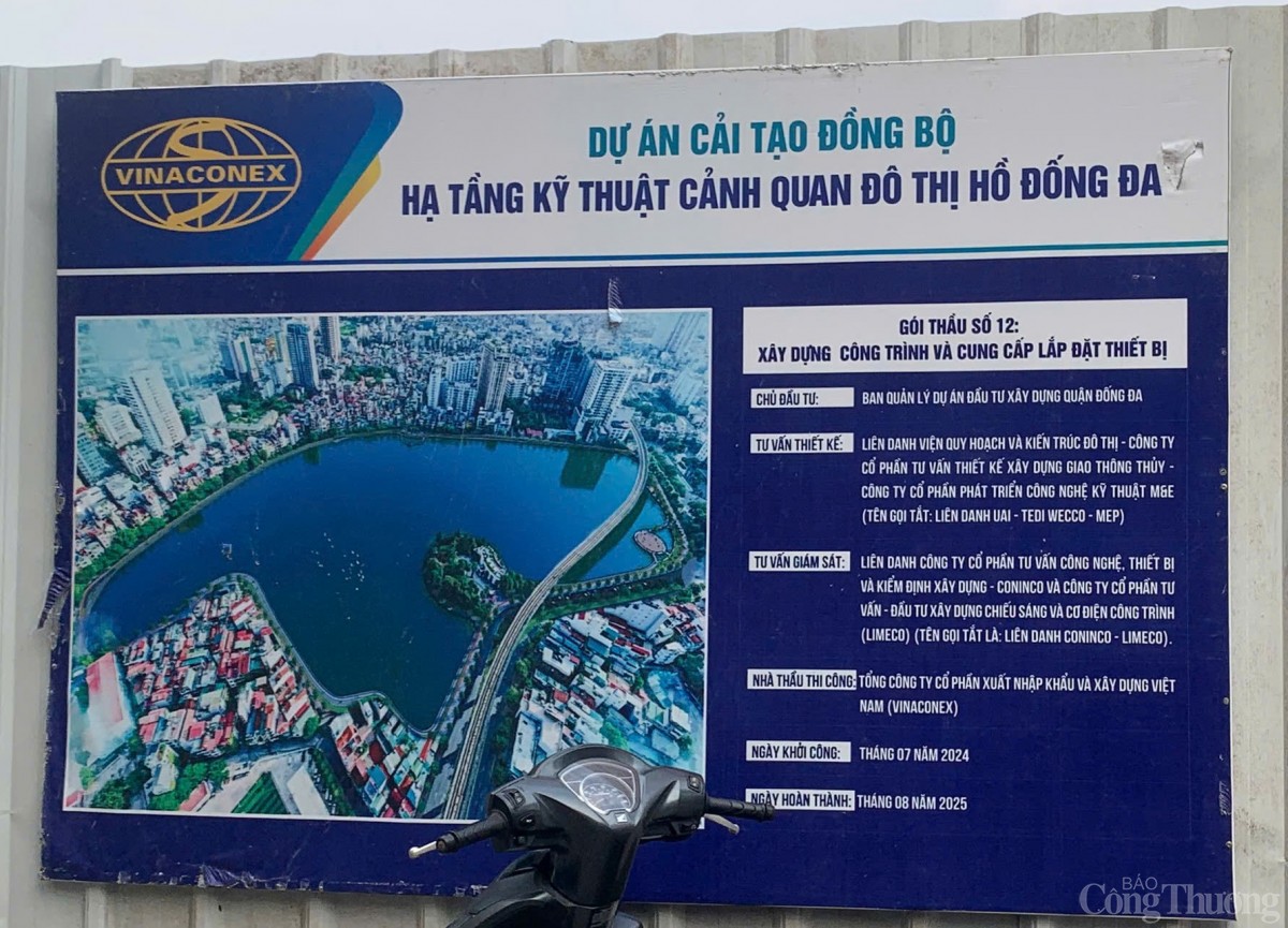 Theo ghi nhận của phóng viên Báo Công Thương, tại hiện trường, lượng lớn vật liệu xây dựng được san lấp lên diện tích vốn là lòng hồ Đống Đa. Nhà thầu thi công - Tổng Công ty CP Xuất nhập khẩu và xây dựng Việt Nam (Vinaconex) hiện quay tôn kín xung quanh khu vực này.