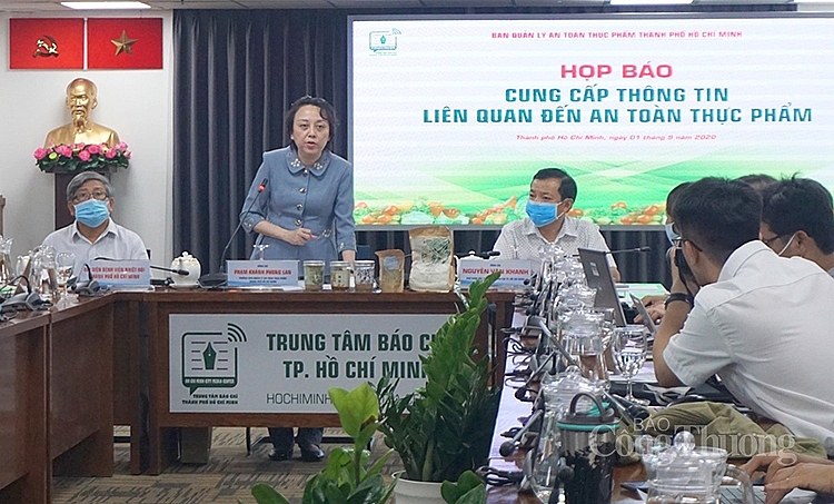 Bà Phạm Khánh Phong Lan - Trưởng Ban Quản lý An toàn Thực phẩm TP. Hồ Chí Minh cung cấp thông tin về pate Minh Chay tại buổi họp báo