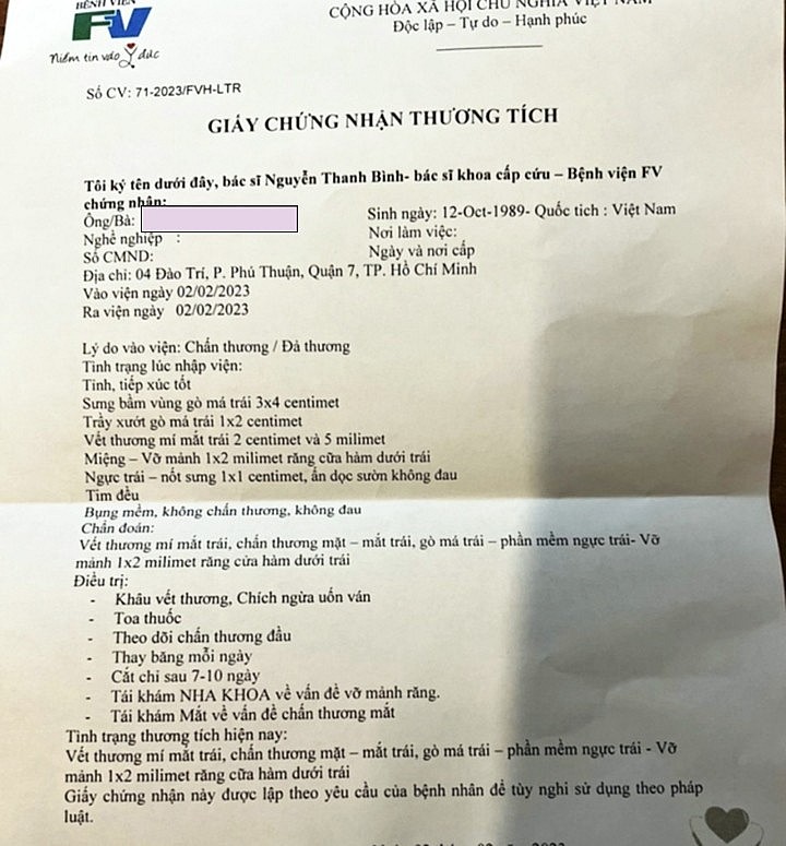 Sau đó, anh Dũng đã trình báo sự việc lên cơ quan Công an phường Phú Thuận (quận 7). Qua chẩn đoán tại Bệnh viện Pháp Việt, anh Dũng bị sưng bầm và trầy xước vùng gò má trái; rách mí má trái phải khâu 5 mũi; vỡ mảnh răng cửa hàm dưới trái; có vết sưng ở vùng ngực phải.