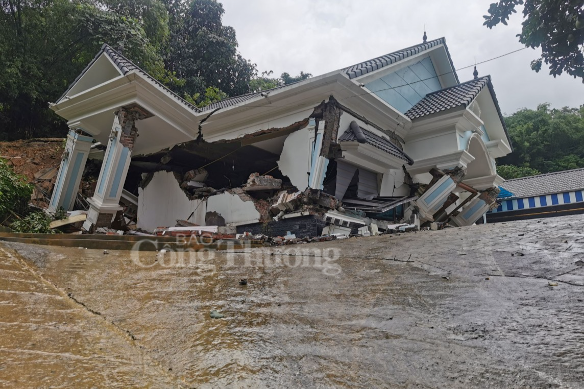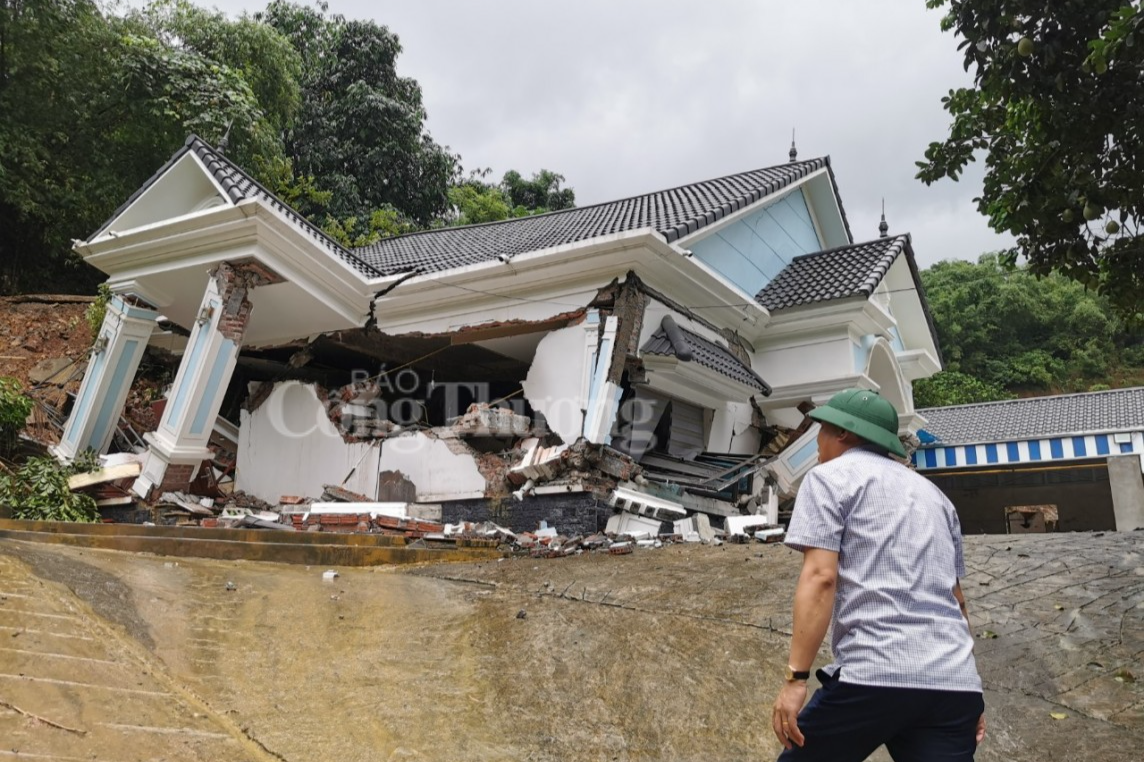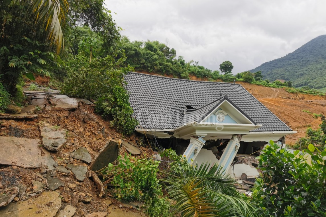 | Đất đá từ trên cao tràn xuống khiến cho căn biệt thự liêu xiêu. Tuy nhiên, hiện tại nó vẫn chưa đổ sập hẳn xuống nên cơ quan chức năng và người nhà chưa thể tiếp cận để tìm tài sản. |