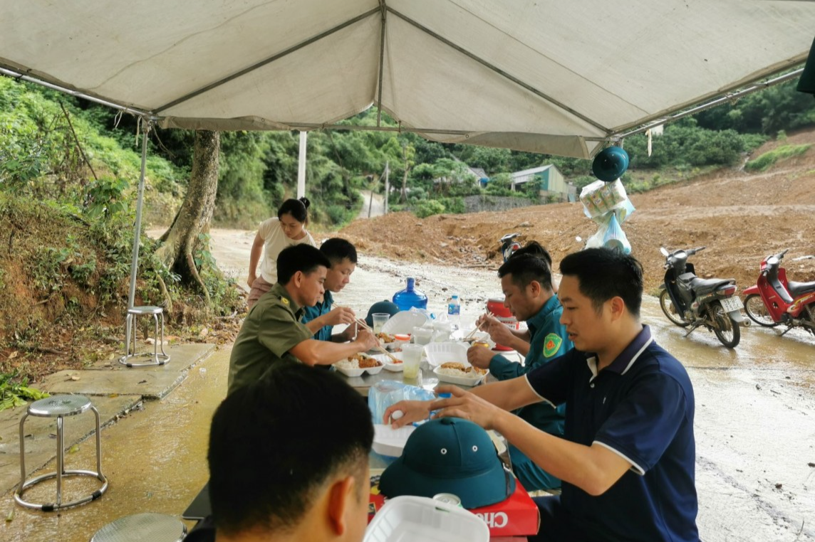| Bữa cơm muộn của lực lượng chức năng làm việc tại hiện trường. |