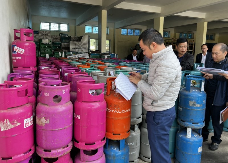 | Lực lượng chức năng và đại diện các doanh nghiệp phối hợp kiểm đếm các bình gas |