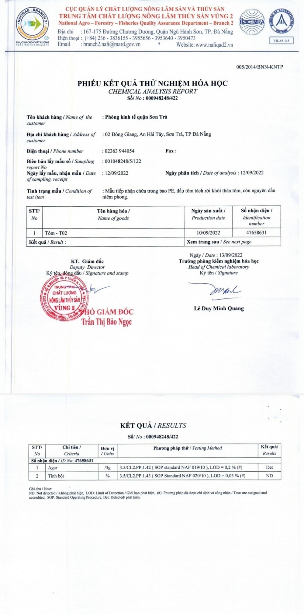 Trung tâm Chất lượng Nông lâm thủy sản vùng II thông báo kết quả thử nghiệm: Mẫu tôm của người bán (T-01) không phát hiện tạp chất tinh bột và Agar; Mẫu tôm của người mua (T-02) có phát hiện tạp chất Agar (thạch rau câu).