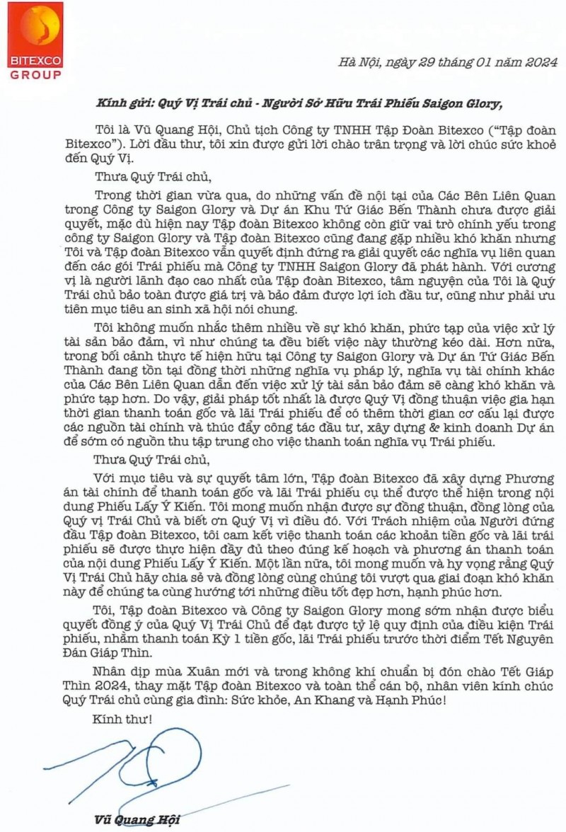“Với cương vị là người lãnh đạo cao nhất của Tập đoàn Bitexco tâm nguyện của tôi là quý trái chủ bảo toàn được giá trị và bảo đảm được lợi ích đầu tư, cũng như phải ưu tiên mục tiêu an sinh xã hội nói chung”, trích thư của ông Vũ Quang Hội.