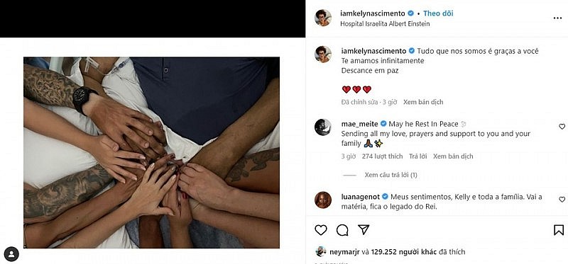Trên trang cá nhân, Kely Nascimento, con gái Pele, đăng bức hình xúc động, xác nhận sự ra đi của "Vua bóng đá": "Tất cả những gì chúng con có được là nhờ bố. Tình yêu chúng con dành cho bố là vô hạn. Hãy yên nghỉ nhé", Kely Nascimento đăng bức hình Pele cùng 5 thành viên trong gia đình trước thời khắc đau buồn của bóng đá thế giới.