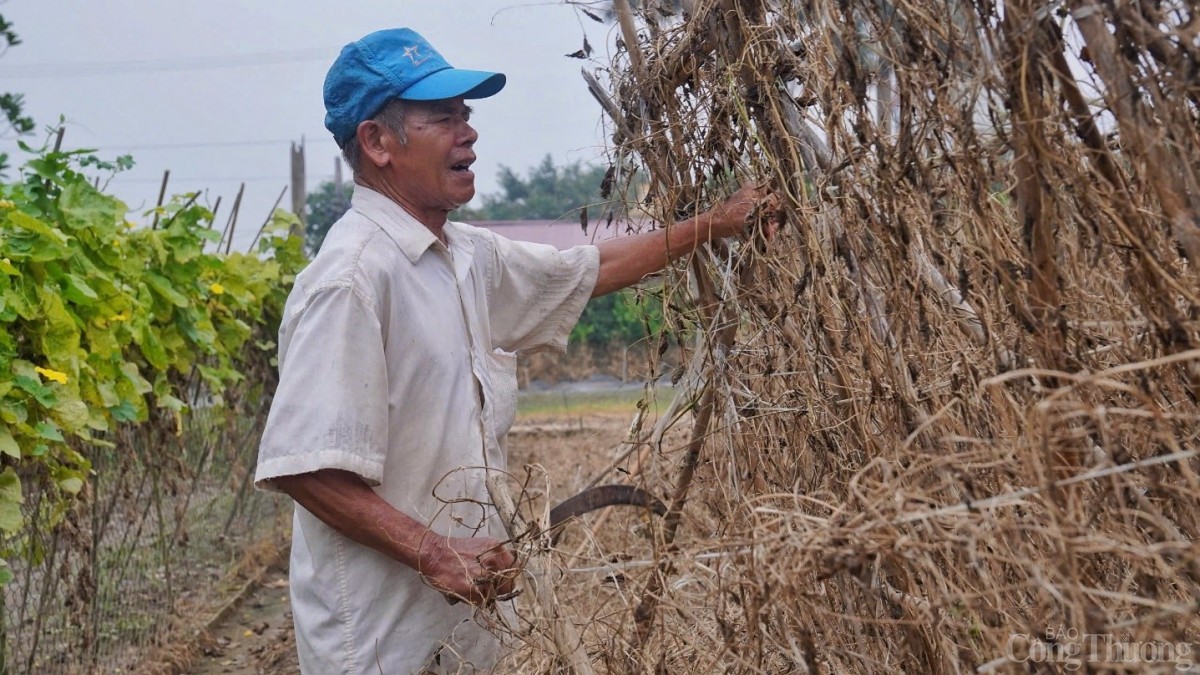 | Ông Võ Văn Lừng bên cạnh giàn mướp đã héo khô |