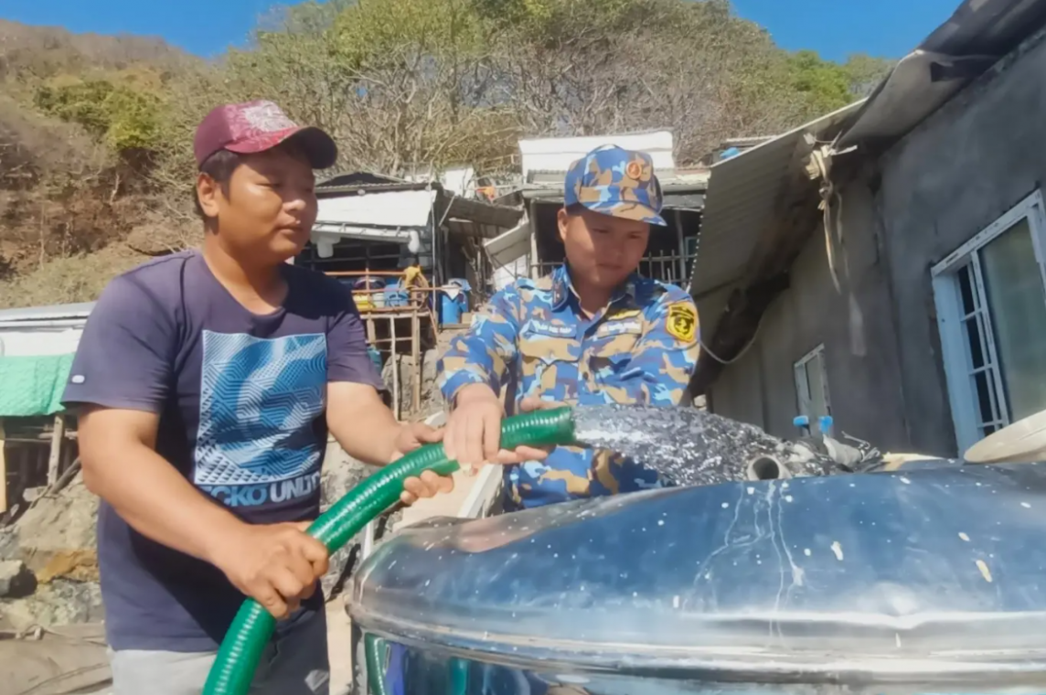 | Nước ngọt được cán bộ, chiến sĩ Vùng 5 Hải quân đưa đến tận các gia đình cấp cho người dân |
