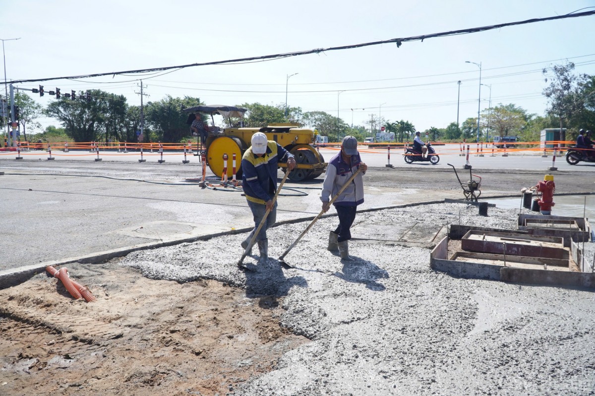 | Công nhân đang thi công tại nút giao nối đường Hàng Điều với đường 3/2. Ảnh: Nguyễn Ngọc |