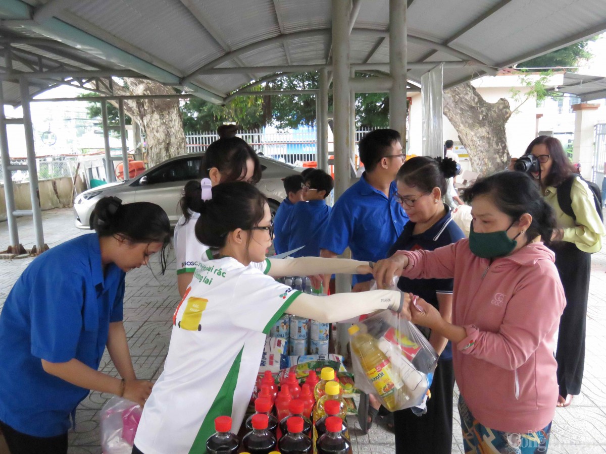 Trong sáng nay, nhiều người dân ở xã đảo Long Sơn đã mang tới những bao lớn rác thải như nhựa, bìa các-tông; vỏ lon bia, nước ngọt…để đổi lấy những sản phẩm như dầu ăn, mì chính, nước rửa chén,…