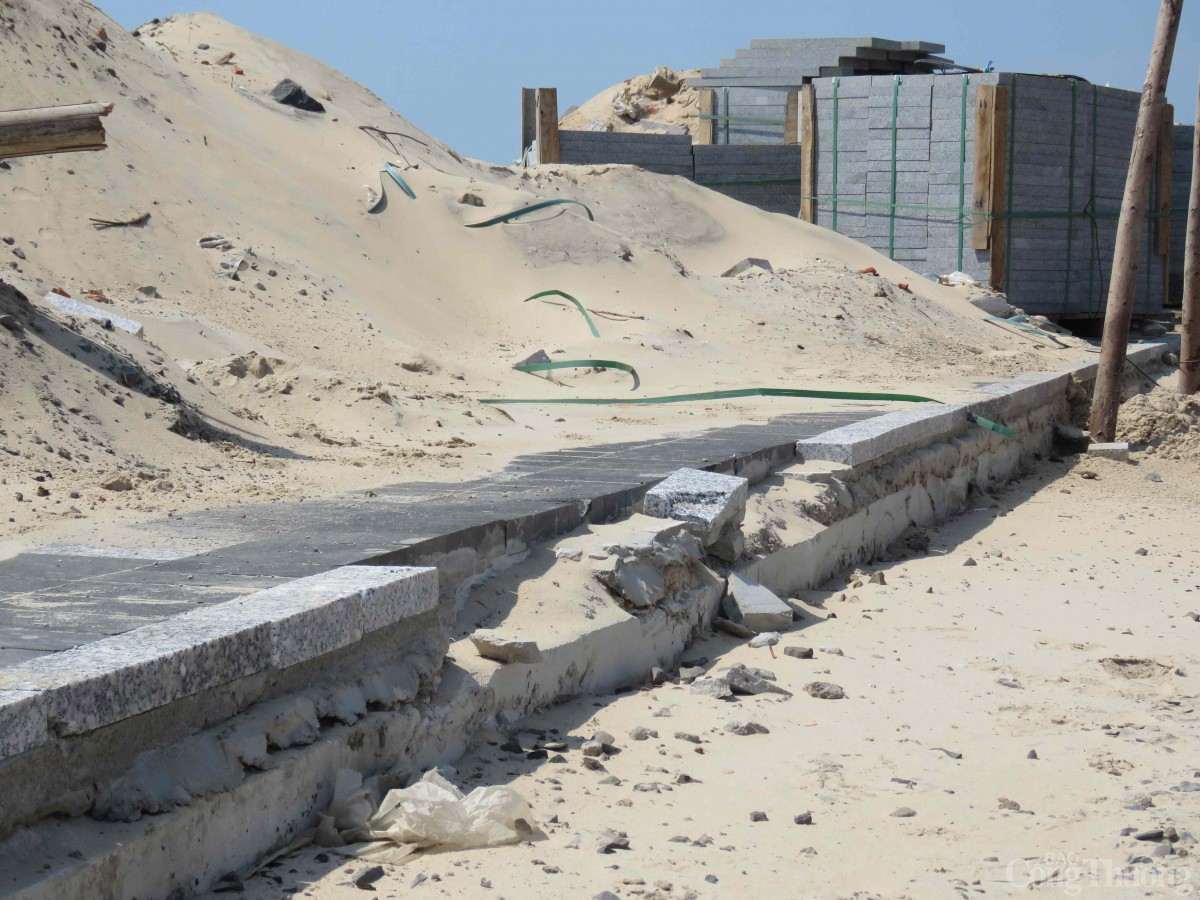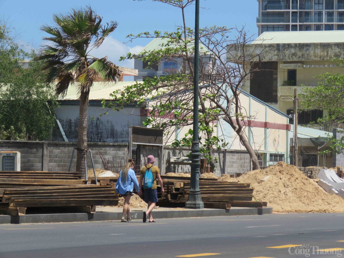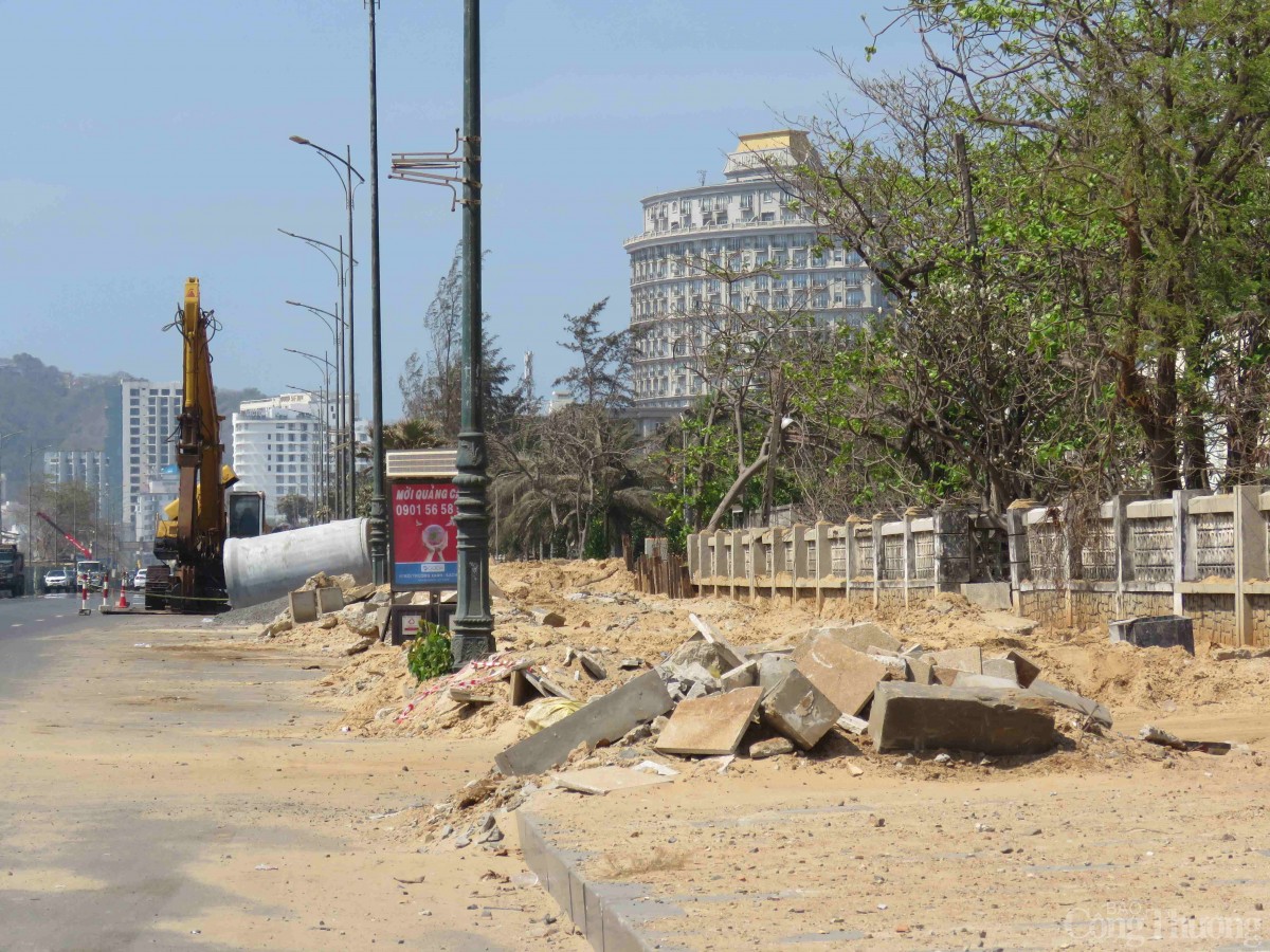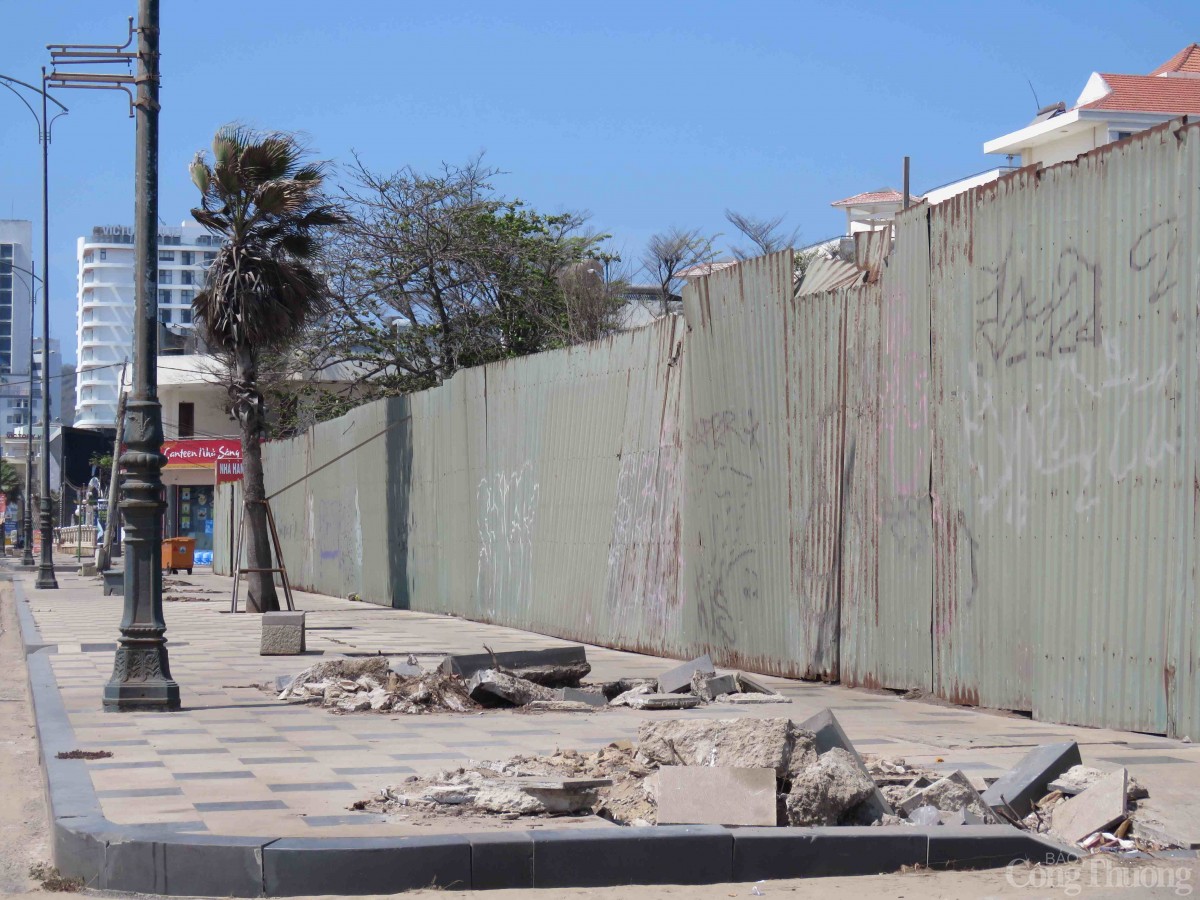 Ở phía rìa biển, nhiều khu vực đã được trồng cây xanh, hình hài khuôn viên đã dần hiện rõ. Phần vỉa hè cũng đã được lát gạch, tuy nhiên, lại phải “cõng” hàng chục kiêu gạch khác. Ngoài ra, theo ghi nhận của phóng viên, mặc dù phần vỉa hè mới được lát gạch nhưng một số vị trí có dấu hiệu bong tróc.