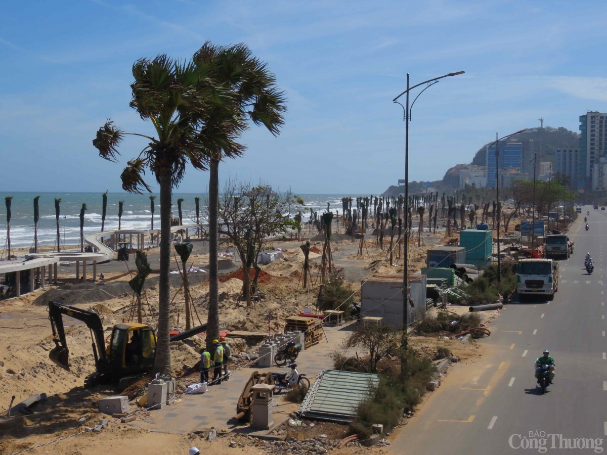 Vì là giáp biển, mặt bằng thi công đa phần là cát, cộng với gió từ biển thổi vào nên bụi từ công trình bay khắp đường Thùy Vân. Một chủ cơ sở kinh doanh tại đây cho biết, bàn ghế cho khách ngồi phải lau liên tục vì bụi. “Dự án khởi công từ trước tết, hàng quán kinh doanh ế ẩm từ bấy đến giờ. Bụi quá nên không có khách, giờ chỉ ngóng đến ngày dự án hoàn thành vào dịp 30/4 mà cũng không biết có kịp không”, người này than thở.