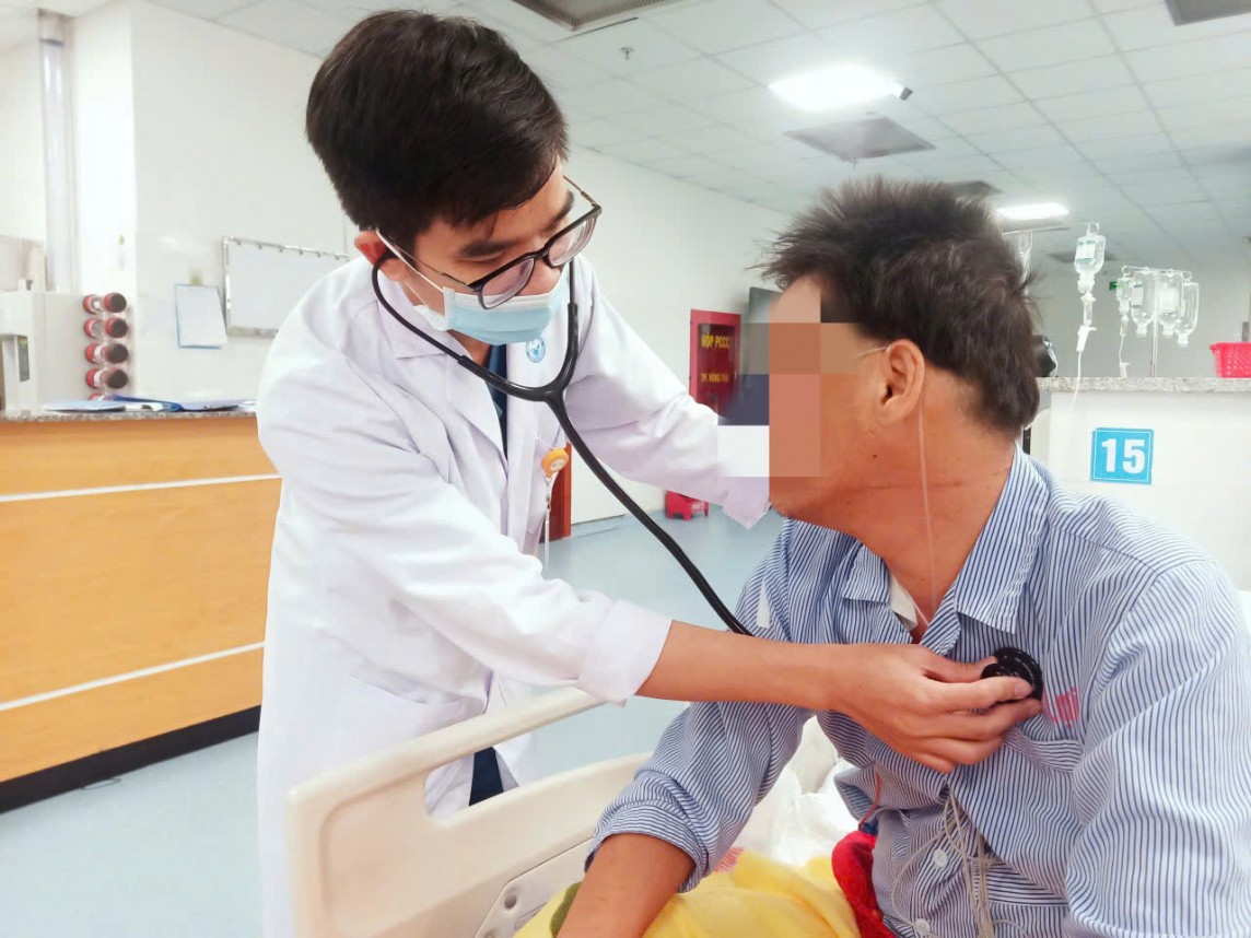 | Bác sĩ Văn Viết Thắng - Khoa Hồi sức tích cực – Chống độc thăm khám cho bệnh nhân sau 2 tuần điều trị. Ảnh: BVCC |