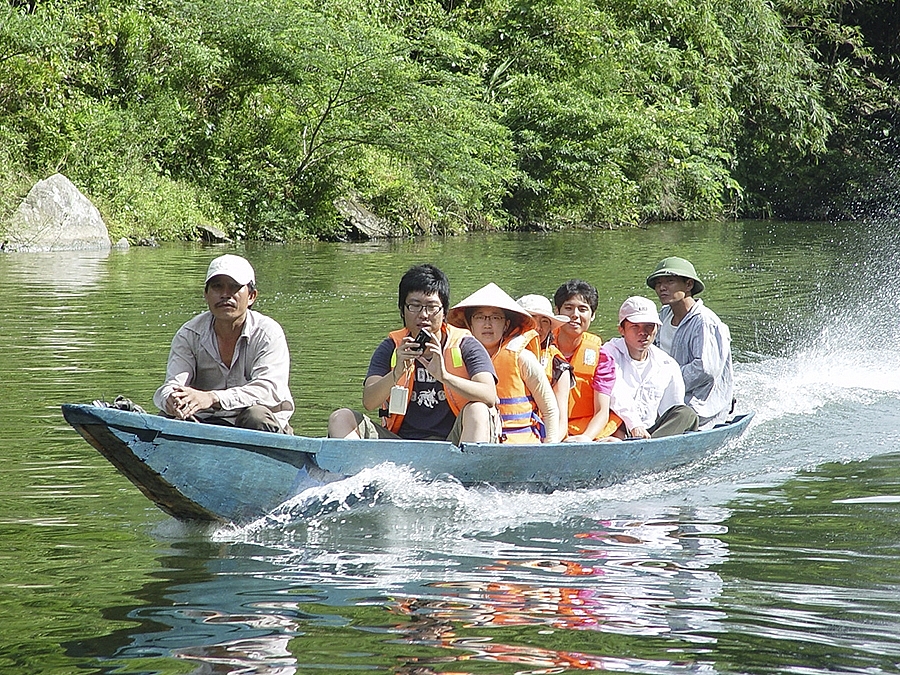 Du khách du thuyền trên sông Giăng thuộc vùng lõi Vườn quốc gia Pù Mát