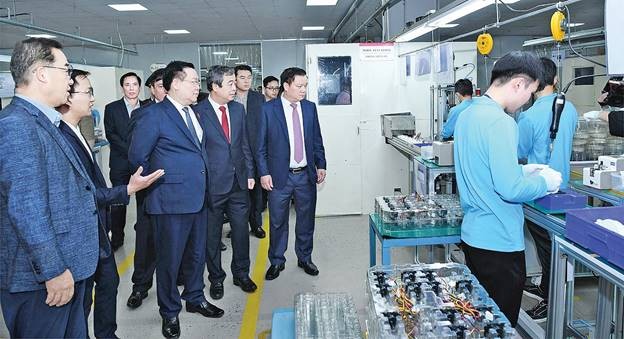 | Chủ tịch Quốc hội Vương Đình Huệ và Bí thư Tỉnh ủy Ngô Đông Hải, lãnh đạo UBND tỉnh Thái Bình tham quan dây chuyền sản xuất của Công ty OHSUNG VINA Thái Bình - Ảnh: Lâm Hiển |