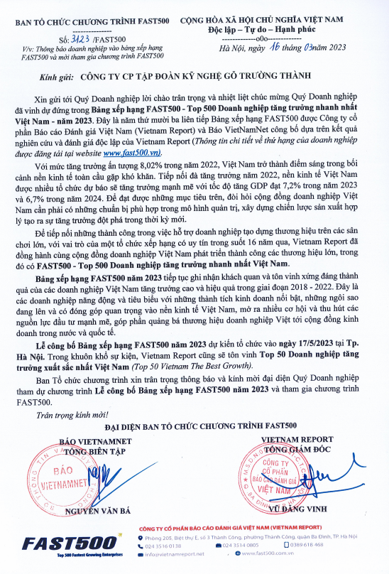 Những kết quả này đã khẳng định hướng đi đúng đắn về khách hàng và thị trường của Tập đoàn Kỹ nghệ Gỗ Trường Thành qua quá trình tái cấu trúc toàn diện suốt 5 năm qua, và tạo đà để tiếp tục đặt các mục tiêu tăng trưởng cao hơn cho các mục tiêu chiến lược đến 2030. Năm 2022, TTF vượt mốc 2,000 tỷ và được Vietnam Report lần đầu đưa vào danh sách 500 Doanh nghiệp tư nhân lớn nhất Việt Nam (VRN500).