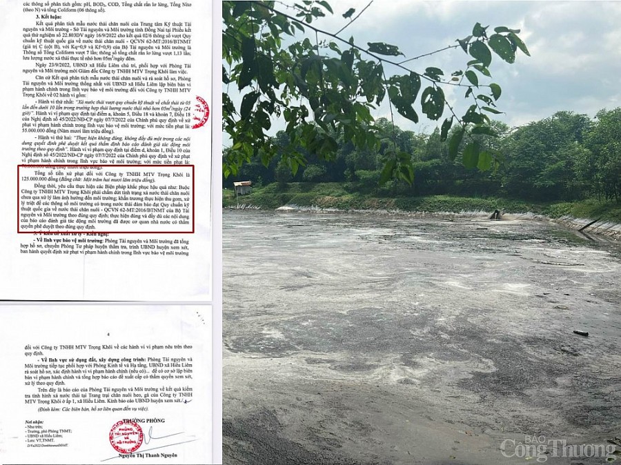 Cụ thể, theo báo cáo, kết quả phân tích mẫu nước thải chăn nuôi của Trung tâm Kỹ thuật Tài nguyên và Môi trường - Sở Tài nguyên và Môi trường tỉnh Đồng Nai tại Phiếu kết quả thử nghiệm số 22.803DV ngày 16/9/2022 cho kết quả 02/6 thông số vượt Quy chuẩn kỹ thuật quốc gia về nước thải chăn nuôi - QCVN 62-MT:2016/BTNMT (giá trị C (cột B), với Kq=0,9 và Kf=0,9) của Bộ Tài nguyên và Môi trường là Thông số Tổng Coliform vượt 7 lần; thông số tổng chất rắn lơ lửng vượt 1,13 lần; lưu lượng nước xả thải thực tế nhỏ hơn 05m/ngày đêm. Ngày 23/9/2022, UBND xã Hiếu Liêm chủ trì, phối hợp với Phòng Tài nguyên và Môi trường mời Giám đốc Công ty TNHH MTV Trọng Khôi làm việc.