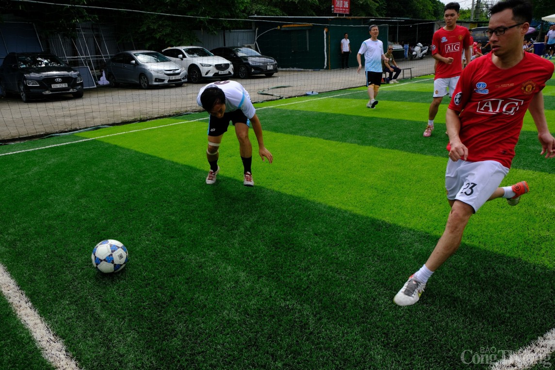 | Một pha tranh chấp của hậu vệ và tiền đạo trong trận đấu giữa Liên quân Đại học Kinh tế - Kỹ thuật công nghiệp - Vụ Tổ chức cán bộ và Vietrans |