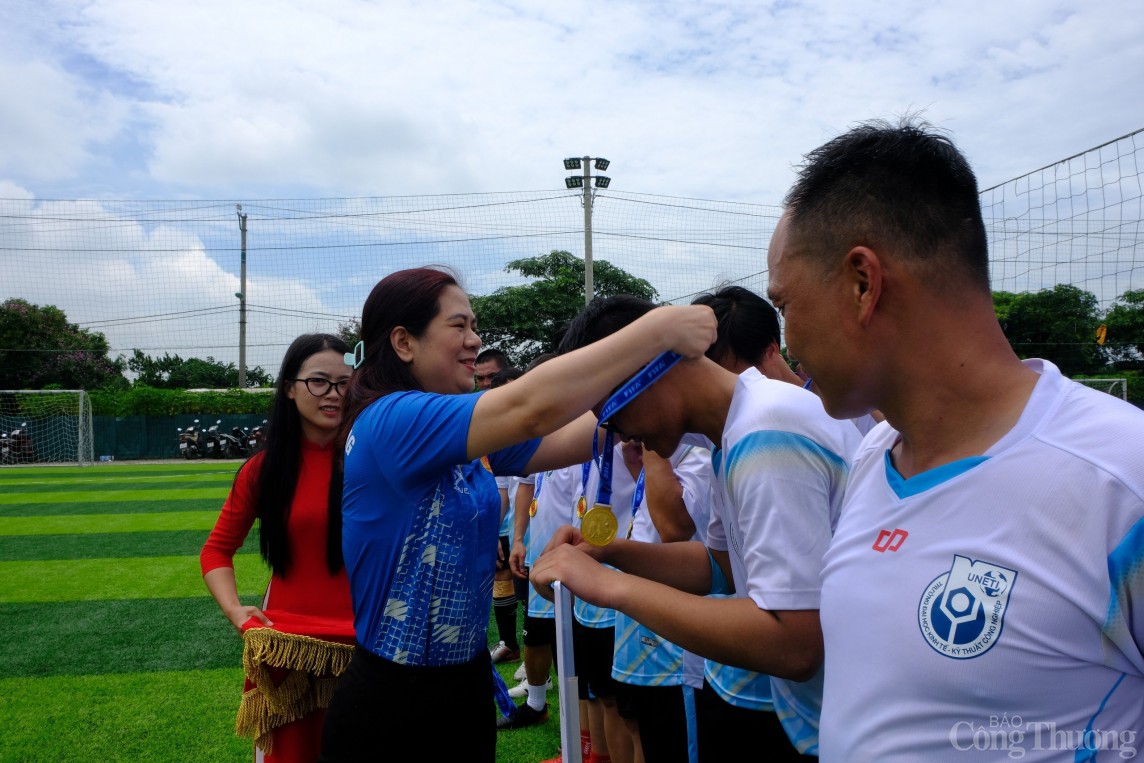 | Bà Nguyễn Minh Huệ - Chủ tịch Công đoàn Bộ Công Thương trao huy chương cho các cầu thủ đội vô địch |