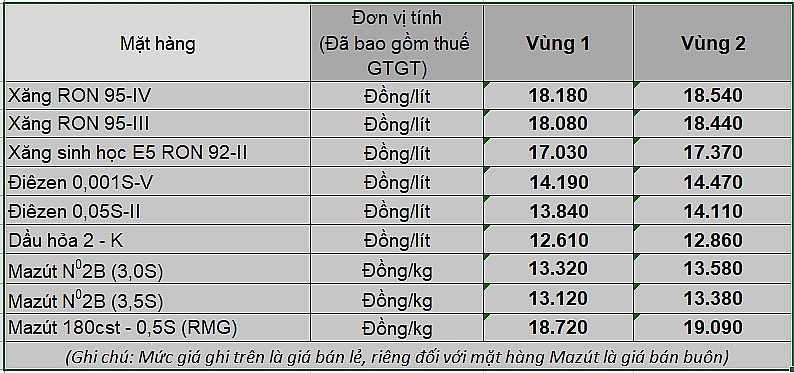 Liên Bộ không trích lập Quỹ BOG đối với tất cả các loại xăng dầu; chi sử dụng Quỹ Bình ổn giá xăng dầu ở mức: E5RON92 ở mức 2.000 đồng/lít (kỳ trước chi 1.729 đồng/lít), xăng RON95 ở mức 1.150 đồng/lít (kỳ trước chi 847 đồng/lít), dầu diesel ở mức 850 đồng/lít (kỳ trước chi 643 đồng/lít), dầu hỏa chi ở mức 900 đồng/lít (kỳ trước chi 635 đồng/lít); dầu mazut ở mức 800 đồng/kg (kỳ trước chi 603 đồng/kg).