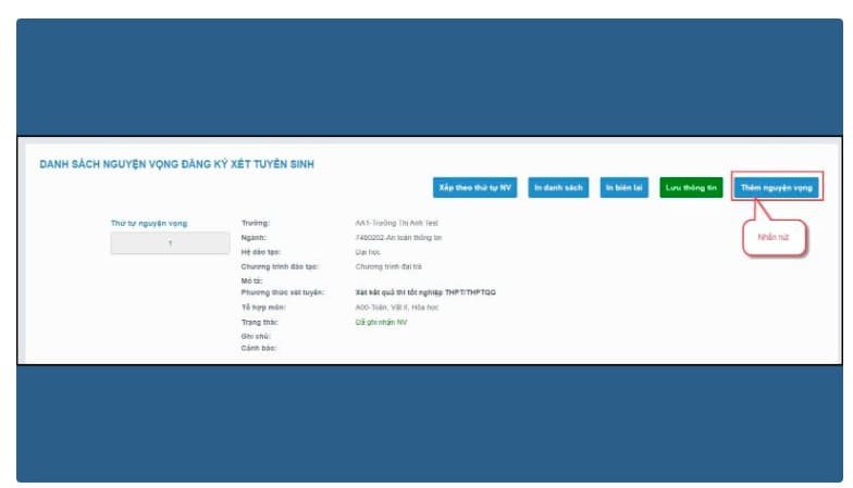 Nếu muốn thêm mới các nguyện vọng, bạn tiếp tục nhấp vào “Thêm nguyện vọng” và thao tác tương tự như hướng dẫn ở trên.