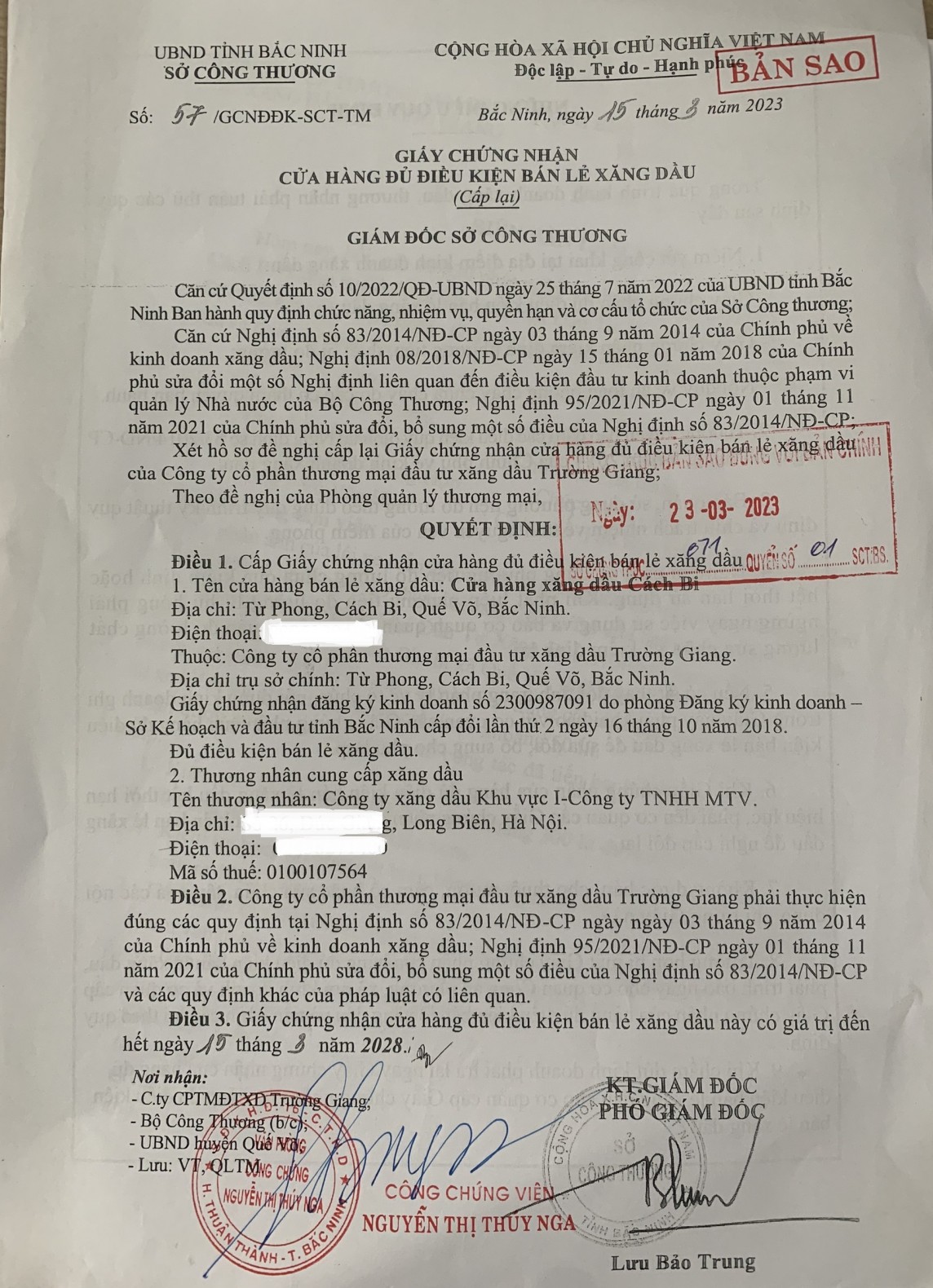 | Giấy chứng nhận đủ điều kiện bán lẻ xăng dầu của Cửa hàng xăng dầu Trường Giang. |
