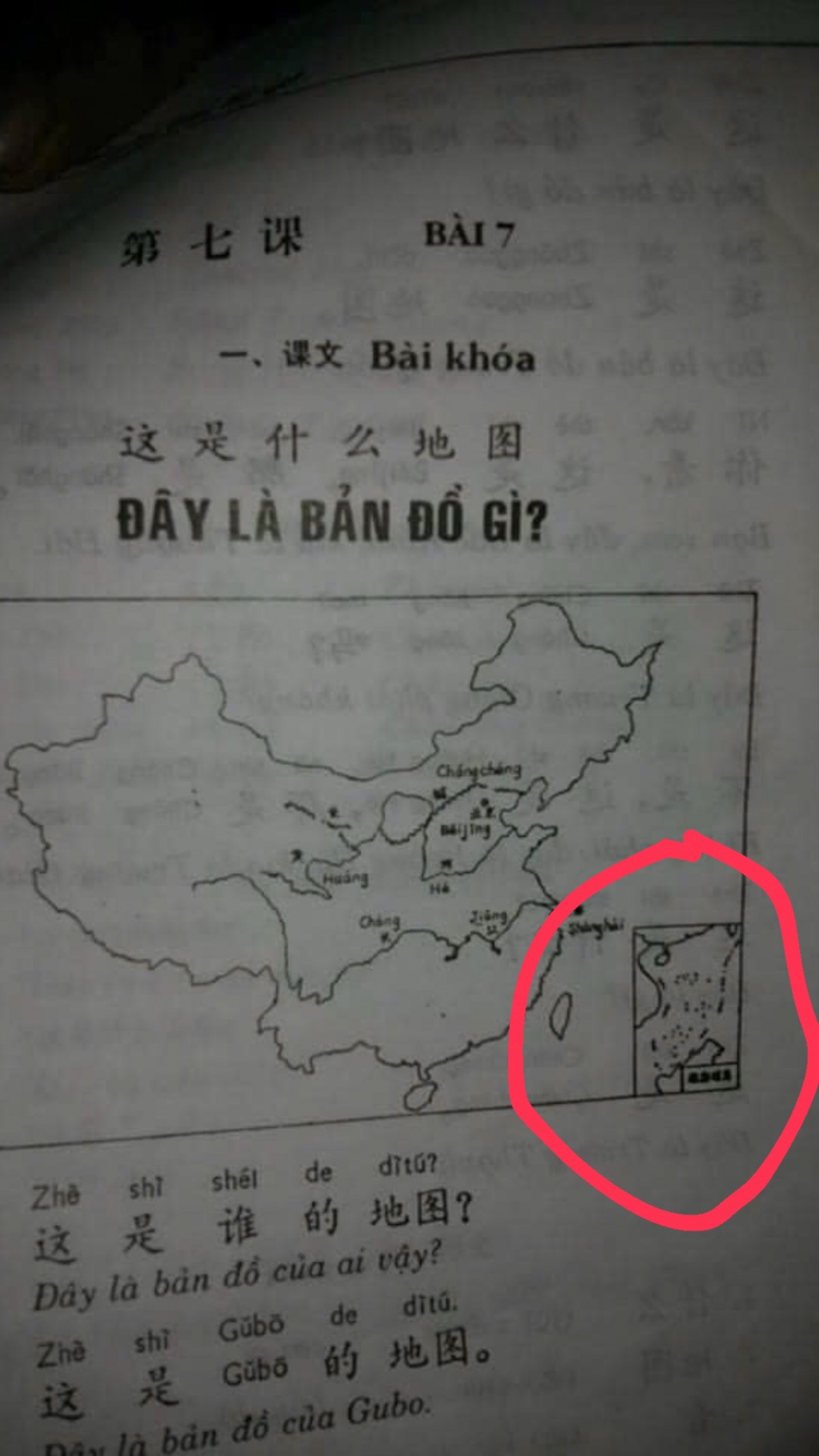 | Hình ảnh "đường lưỡi bò" xuất hiện trên các giáo trình tiếng Trung Quốc. Ảnh: NDCC |