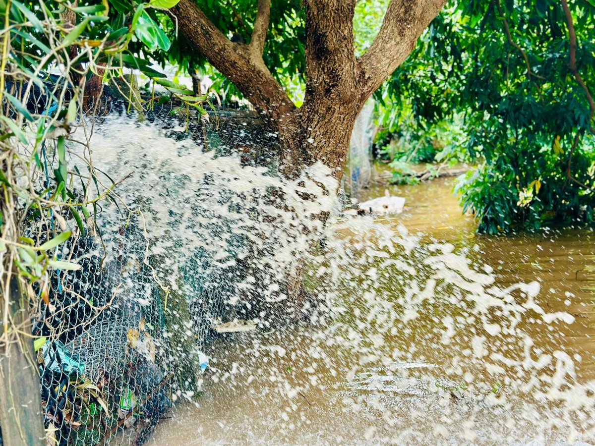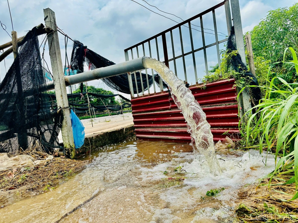 | Máy bơm nước được người dân sử dụng hết công suất để xả nước. |