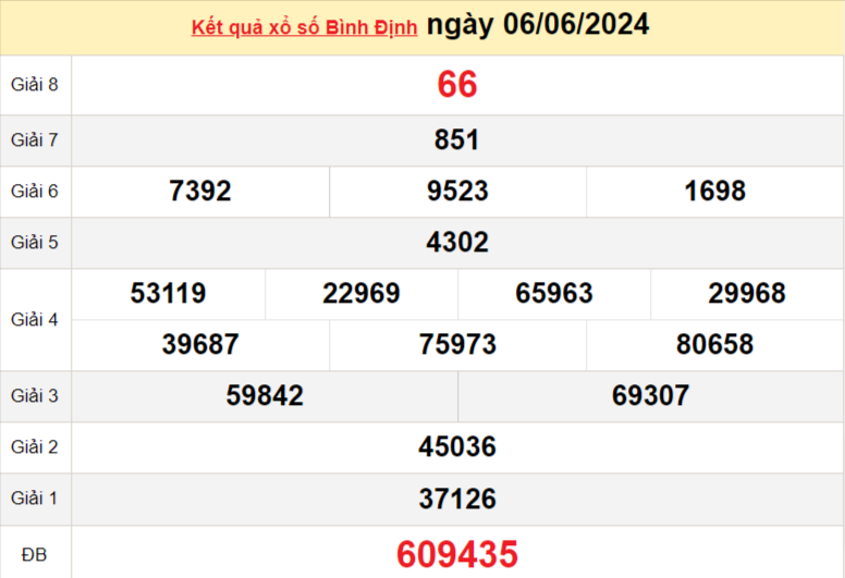 Cập nhật Kết quả Xổ số Bình Định hôm nay 13/6/2024, xổ số Bình Định ngày 13 tháng 6, XSBDI thứ Năm 13/6/2024 - XSBDI 13/6, xổ số Bình Định thứ Năm được quay trả thưởng tại Bình Định vào lúc 17 giờ 15 phút. Kết quả xổ số hôm nay của Bình Định trên kênh trực tuyến dưới đây: