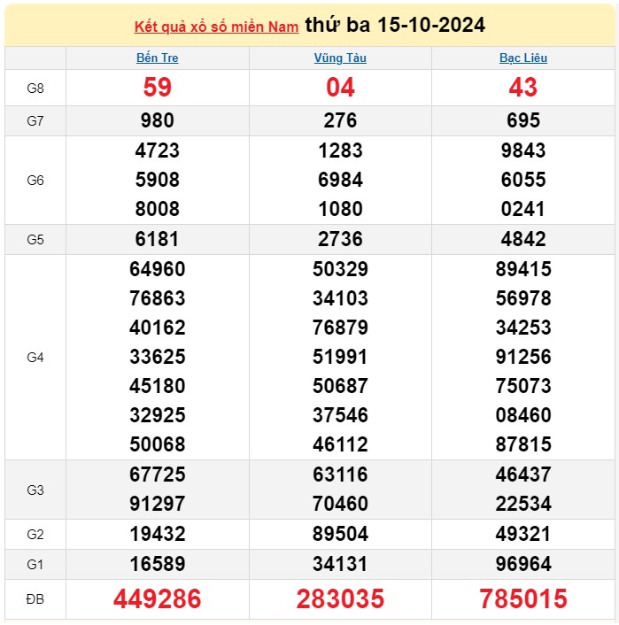 XSMN, Xổ số miền Nam ngày 15 tháng 10