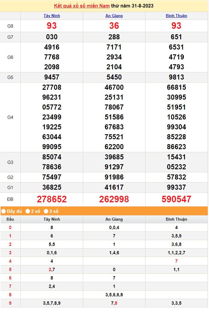 • Thứ 5: xổ số An Giang (XSAG), xổ số Tây Ninh (XSTN), xổ số Bình Thuận (XSBTH)
