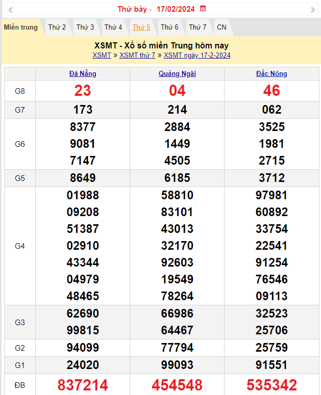 • Thứ 7: xổ số Đà Nẵng (XSDNA), xổ số Quảng Ngãi (XSQNG), xổ số Đắk Nông (XSDNO).