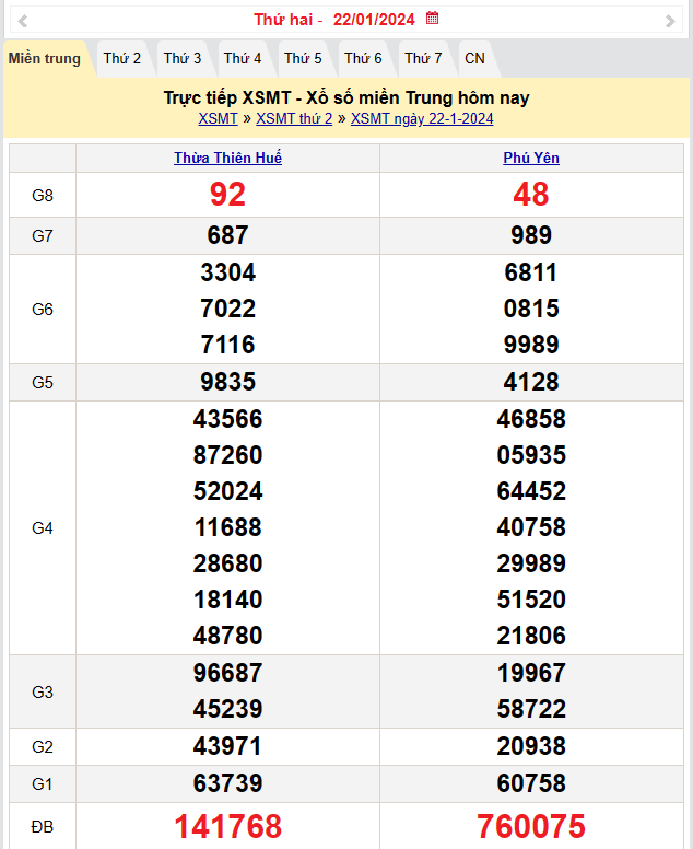 | XSMT 22/1, trực tiếp kết quả xổ số miền Trung thứ Hai ngày 22/1/2024 |