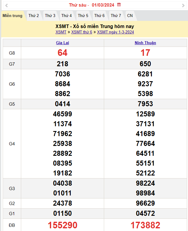 • Thứ 6: xổ số Gia Lai (XSGL), xổ số Ninh Thuận (XSNT).