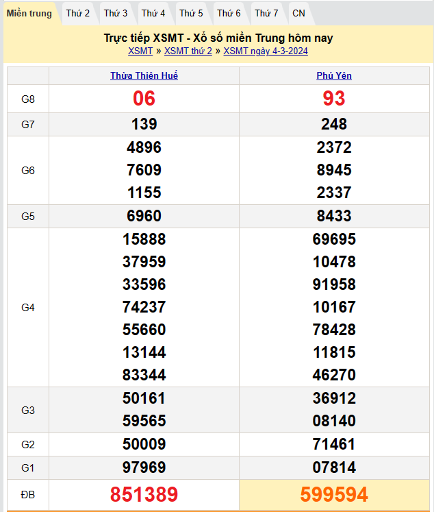 XSMT, Xổ số miền Trung ngày 4 tháng 3