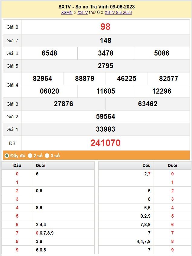 | Kết quả Xổ số Trà Vinh ngày 09 tháng 6 |