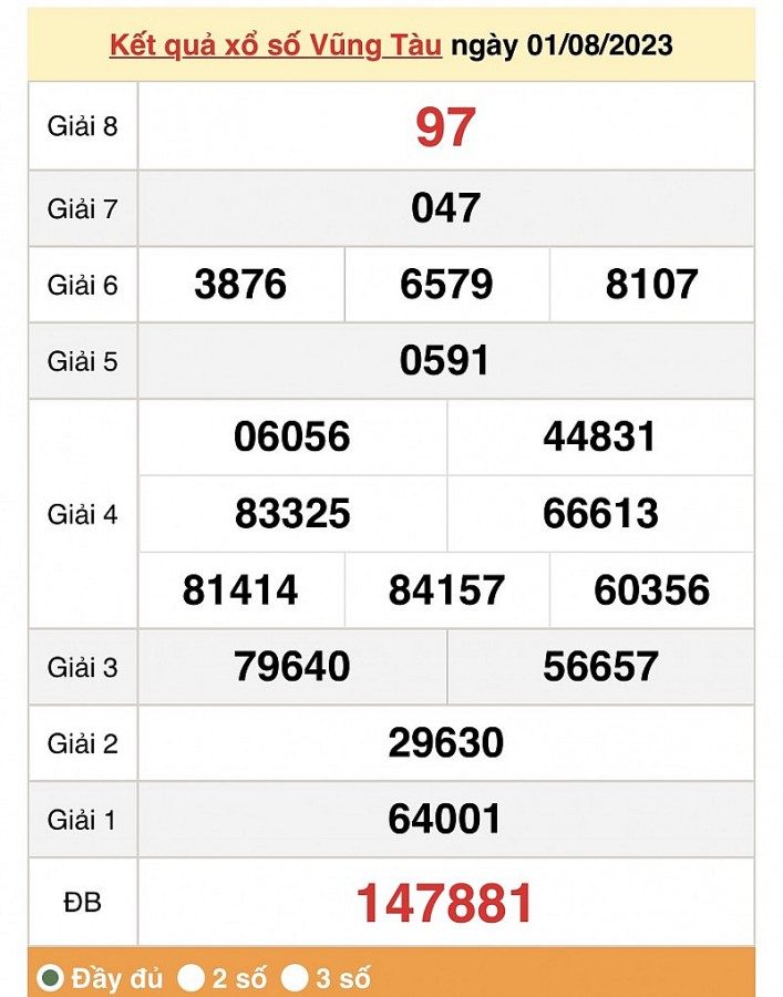 XSVT 1/8, Kết quả Xổ số Vũng Tàu ngày 1 tháng 8