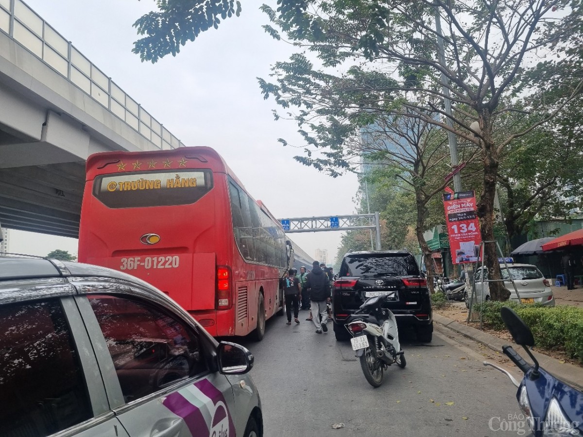 | Nhà xe dừng đón trả khách bừa bãi trên đường Phạm Văn Đồng, TP. Hà Nội gây nên cảnh tắc đường. |
