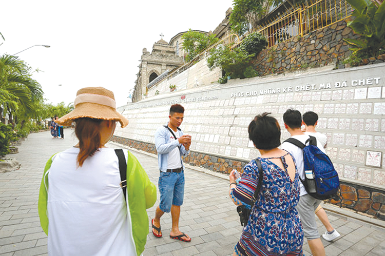 | Hướng dẫn viên người Trung Quốc đưa khách tham quan di tích nhà thờ Núi (TP. Nha Trang) Ảnh: Tiến Thành |