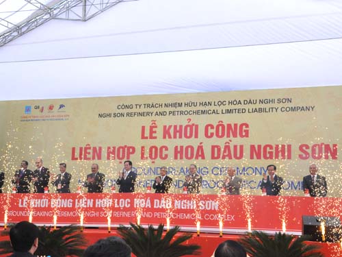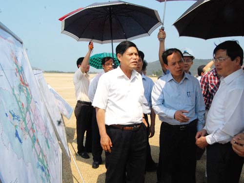 Bộ trưởng Vũ Huy Hoàng (ngoài cùng bên phải) và Chủ tịch UBND tỉnh Thanh Hóa Trịnh Văn Chiến (đứng giữa) thăm khu kinh tế Nghi Sơn