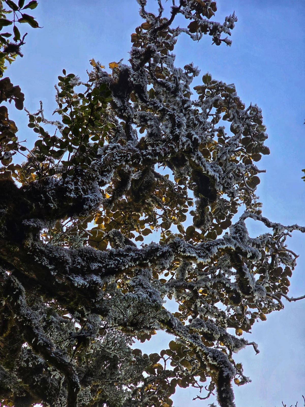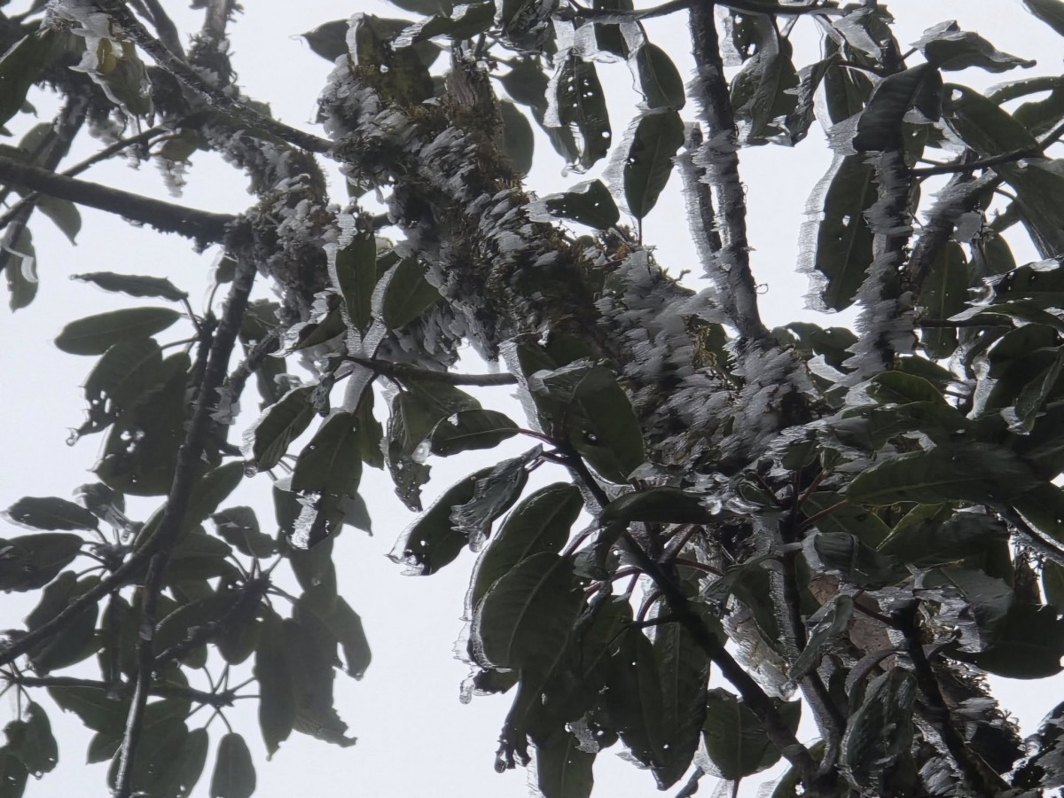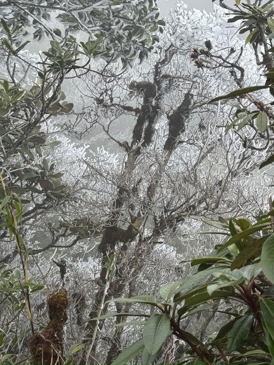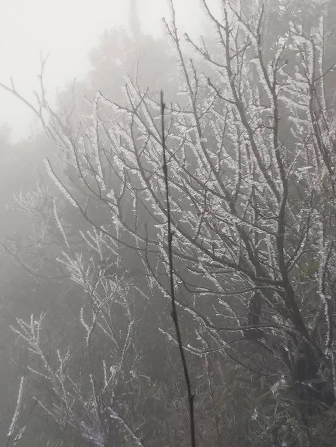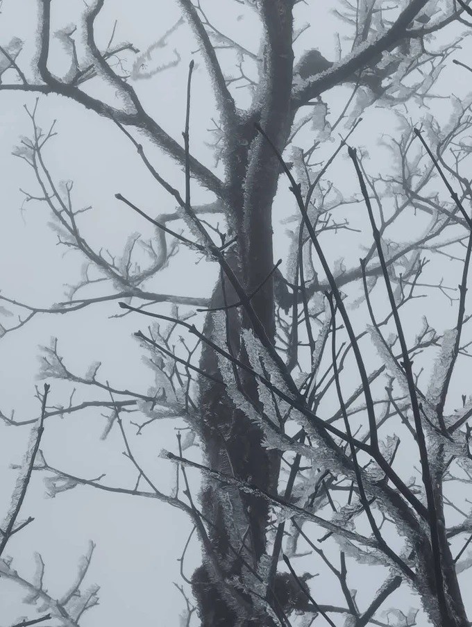 | Băng tuyết cũng xuất hiện trên cây tại khu vực La Pán Tẩn vào ngày 11/1. Ảnh: Ku Porter |