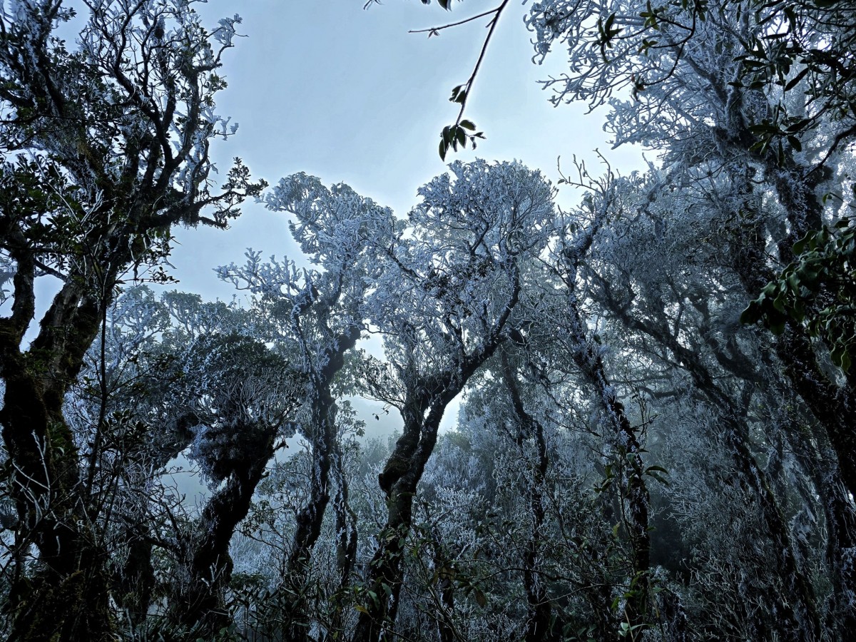 | Băng tuyết bám trên các cành cây tại khu vực đỉnh đèo La Pán Tẩn. Ảnh: Ku Porter |