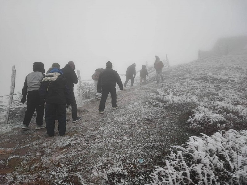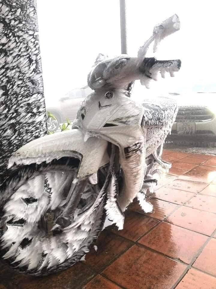 Theo thông tin từ Ban quản lý du lịch Mẫu Sơn, từ chiều tối qua nhiệt độ trên đỉnh Mẫu Sơn đã xuống dưới 0 độ C. Đến sáng nay, băng tuyết càng dày đặc hơn. Trên khắp nhà cửa, xe cộ, cành cây, ngọn cỏ đều phủ một màu trắng xóa.