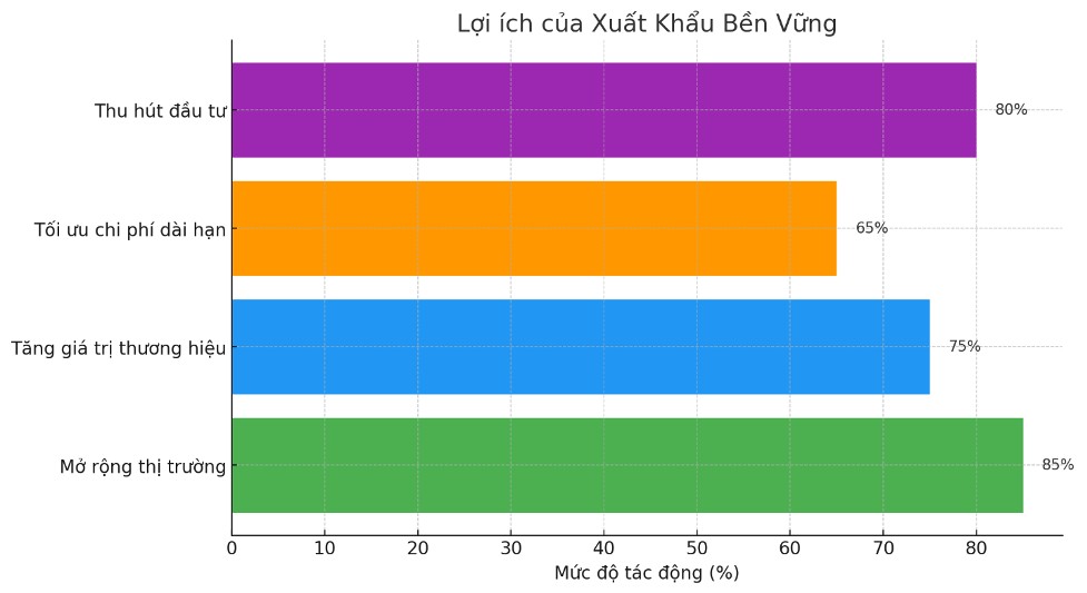 Từ biểu đồ trên cho thấy lợi ích của xuất khẩu bền vững: Mở rộng thị trường (85%) áp ứng tiêu chuẩn xanh giúp tiếp cận thị trường khó tính như EU, Mỹ. Bởi các thị trường này ngày càng ưu tiên sản phẩm có chứng nhận bền vững, tạo cơ hội mở rộng thị phần. Tăng giá trị thương hiệu (75%), doanh nghiệp được đánh giá cao về trách nhiệm xã hội và môi trường giúp doanh nghiệp xây dựng uy tín, gia tăng lòng tin của khách hàng và đối tác. Tối ưu chi phí dài hạn (65%), tiết kiệm chi phí sử dụng nguyên liệu tái tạo, tối ưu năng lượng giúp giảm chi phí sản xuất dài hạn. Đầu tư vào năng lượng tái tạo, tối ưu hóa quy trình giúp doanh nghiệp tiết kiệm chi phí vận hành trong dài hạn. Thu hút đầu tư (80%), doanh nghiệp xanh dễ nhận hỗ trợ tài chính và hợp tác quốc tế. Các nhà đầu tư ngày càng quan tâm đến doanh nghiệp có chiến lược bền vững, thúc đẩy dòng vốn. Giảm rủi ro tuân thủ quy định giúp tránh các rào cản thương mại và thuế quan xanh. Bảo vệ môi trường giảm phát thải, sử dụng tài nguyên bền vững, bảo tồn đa dạng sinh học.