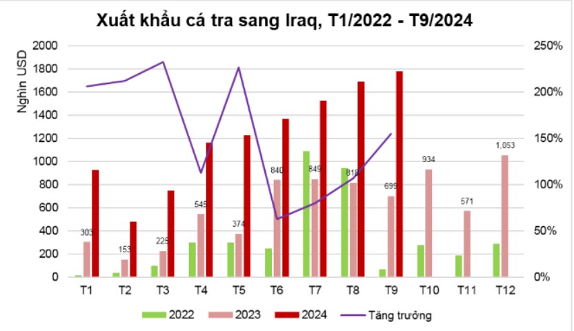 Qúy III/2024, xuất khẩu các sản phẩm cá tra Việt Nam sang quốc gia Trung Đông này đạt gần 5 triệu USD, tăng 111% so với quý III/2023. Lũy kế xuất khẩu cá tra 9 tháng đầu năm 2024 liên tục ghi nhận tăng trưởng dương 2 - 3 con số, đạt 11 triệu USD, tăng 127% so với cùng kỳ năm ngoái và tăng gần gấp rưỡi so với tổng giá trị xuất khẩu cá tra sang Iraq cả năm 2023.