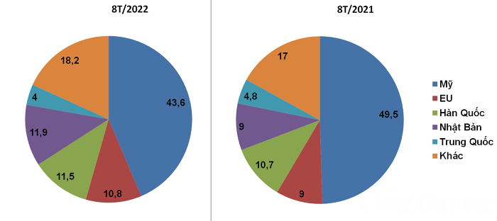 Tỷ trọng các thị trường xuất khẩu dệt may có sự thay đổi trong 8 tháng đầu năm 2022 so với cùng kỳ năm ngoái. (Nguồn: Vitas. Tổng hợp: Minh Anh) |