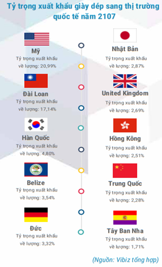 Hầu hết các thị trường tiêu thụ giày, dép của Việt Nam đều có mức tăng trưởng dương trong năm 2017, trong đó, các thị trường chủ đạo tăng khá từ 10 - 30% so với năm 2016 như: Mỹ, Đài Loan, Hàn Quốc, Liên minh châu Âu (EU). Đáng lưu ý, một số doanh nghiệp trong ngành đã lựa chọn những thị trường có quy mô nhỏ, nhưng mức thu nhập của người dân tốt và ưa chuộng những sản phẩm đặc thù riêng như: Nhật Bản, các Tiểu Vương quốc Ả rập Thống nhất. Dự báo đây cũng là xu hướng phát triển lâu dài của ngành giày - dép Việt Nam trong 15- 20 năm nữa.